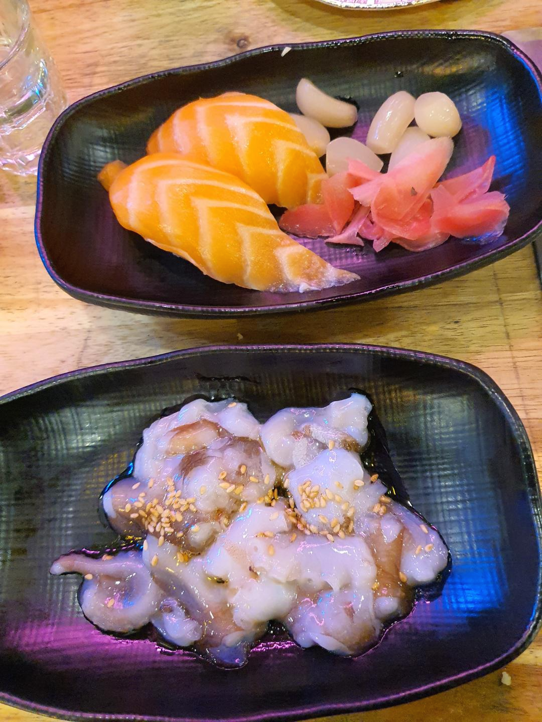 그다음에 산낙지와 연어초밥이 나왔습니다.